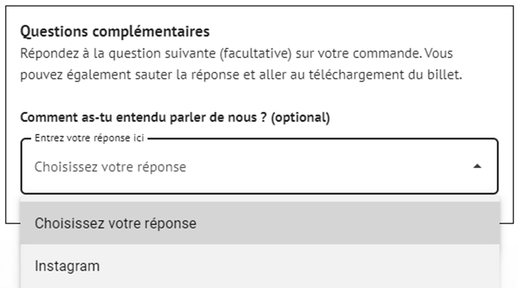 Ajouter des questions obligatoires ou facultatives à votre billetterie en ligne pour en apprendre plus sur vos acheteurs. Demandez par exemple comment ils vous ont trouvé, s'ils ont des restrictions alimentaires, des besoins d'accès particuliers ou autre !