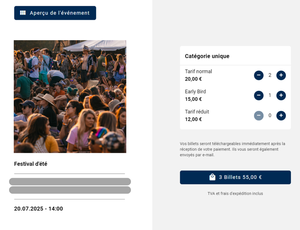 Customisez votre billetterie en harmonisant son design avec votre identité visuelle. Choisissez les couleurs du site, la police d'écriture que vous souhaitez, ajoutez votre logo. Conçu pour la billetterie événementielle, notre outil vous permet de gérer facilement l’organisation de vos événements, leur vente, leur contrôle d'accès pour ainsi optimiser la mise en place et la vente de billets.
